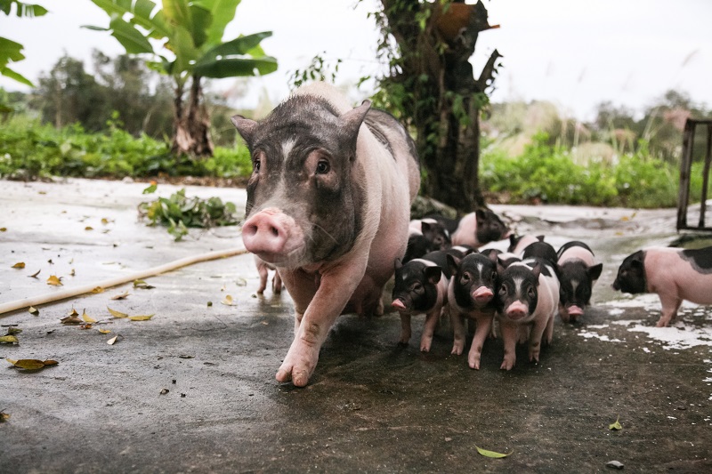 Lợn mẹ dẫn đàn con đi dạo trong trại